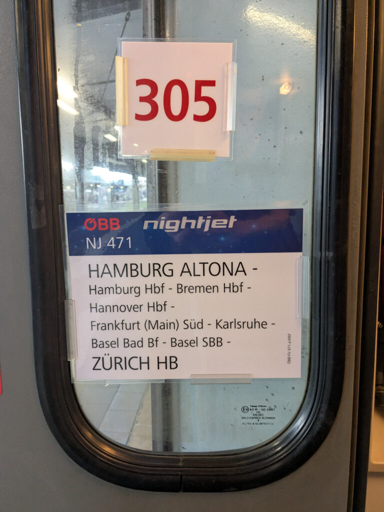 Für die Rückreise rund 2 ½ Wochen danach entschieden wir uns für den Nachtzug von ÖBB, welcher direkt von Hamburg nach Zürich fuhr. Hier hatten wir zum Glück am Tag zuvor nochmals die Verbindung geprüft und bemerkt, dass er wohl nicht wie geplant und auf unseren Tickets vermerkt von Hamburg-Altona aus, sondern von Hamburg-Harburg aus starten würde (wegen kurzfristig notwendiger Bauarbeiten wegen eines Stromleitungsschadens).