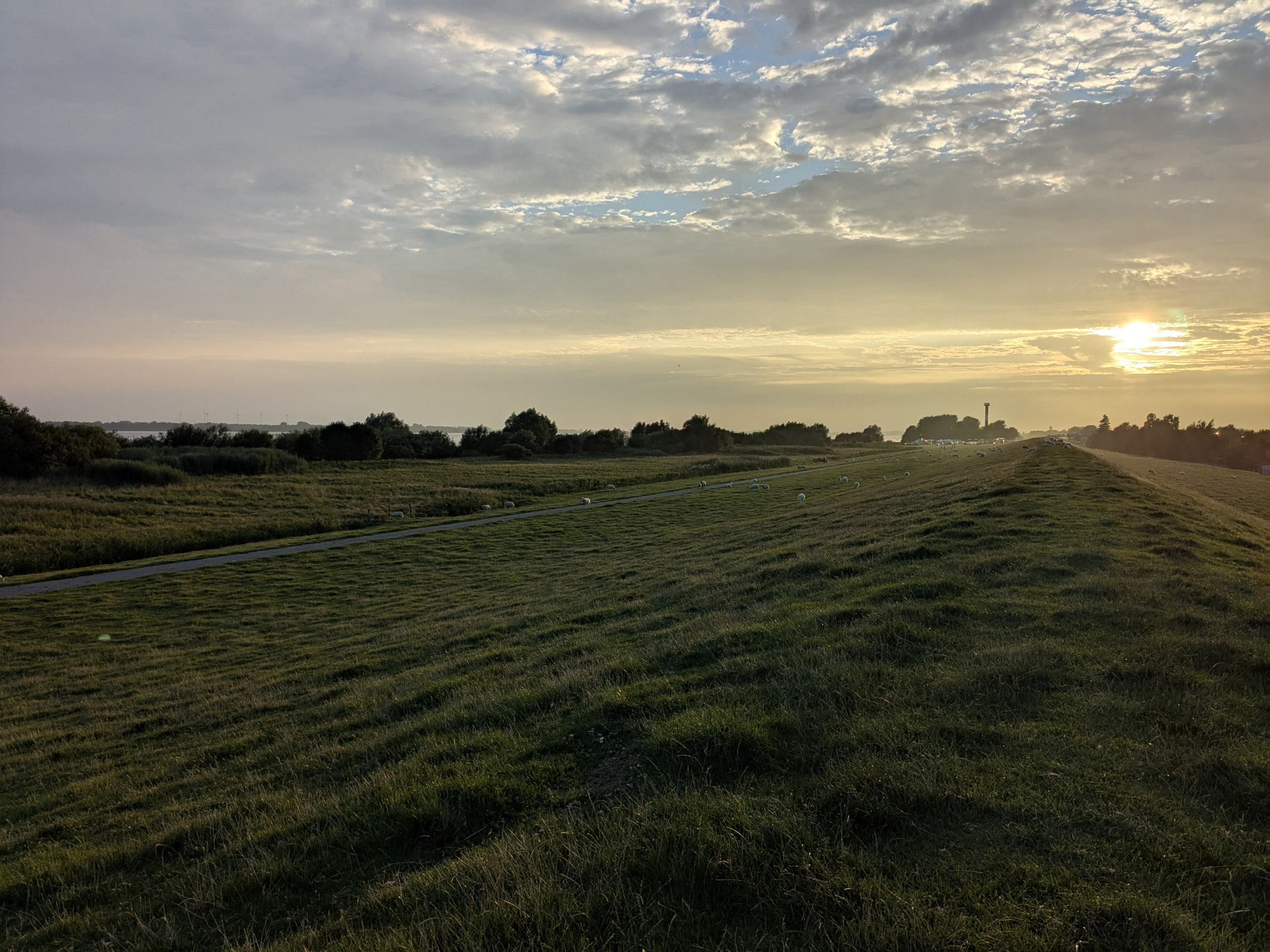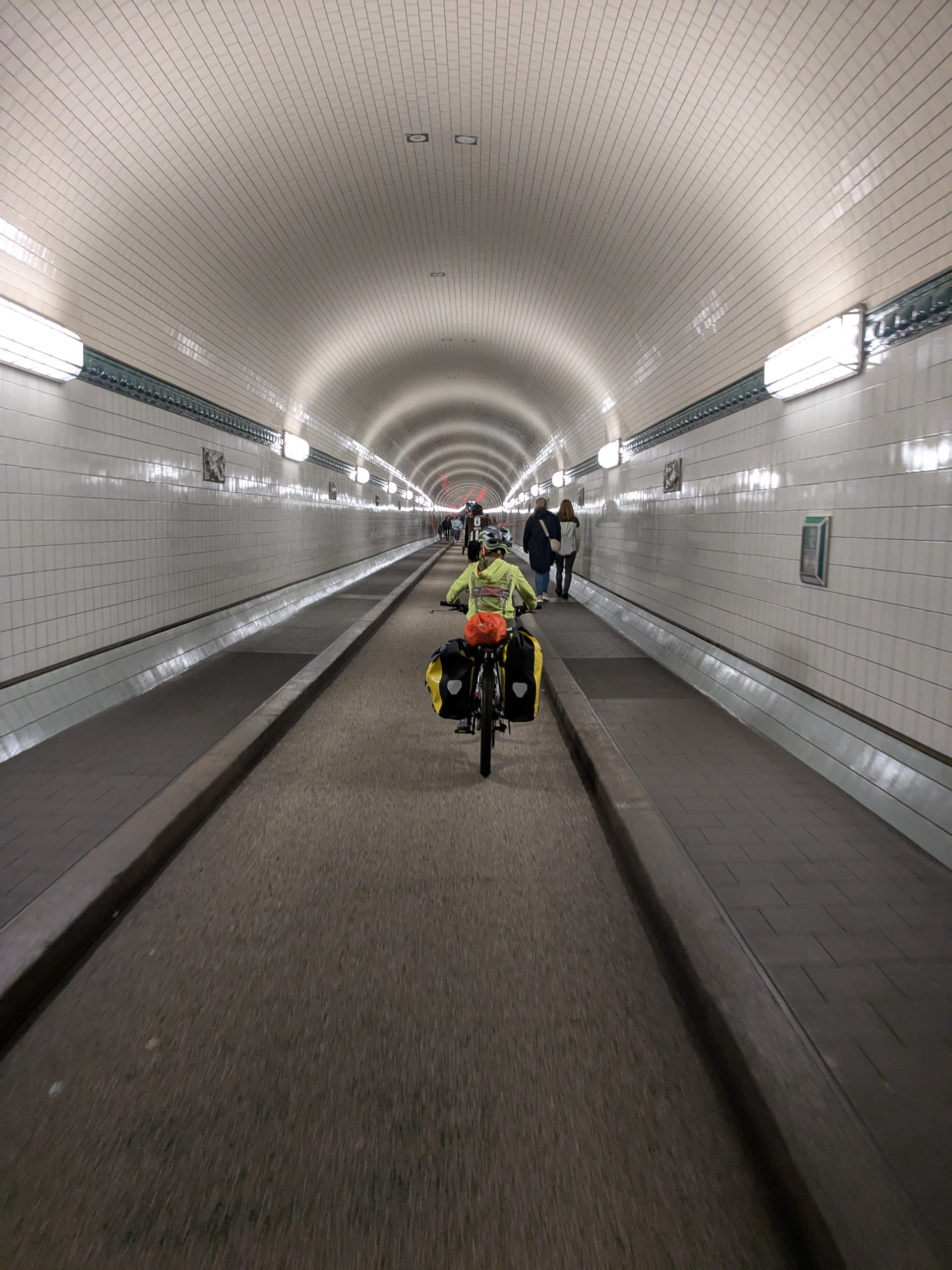 Nach der vorletzten Station Kollmar ging es dem gefühlt ewig langem Deich an wohl tausenden Schafen (und über abertausende Schafköttel) auf die letzten 20 Kilometer Anfahrt auf die Stadt zu, was schon ein Highlight war: hier ging es immer mehr ins urbane Gebiet, der Elbe entlang bei der Schiffsbegrüssungsanlage in Willkommen-Höft vorbei. Bei dieser werden alle schweren Schiffe, welche zur oder von der See her fahren mit Landeshymne begrüsst bzw. verabschiedet und von einem professionellen Team Informationen zum Schiff und Kurs erzählt – eine spannende Sache. Danach folgten wir weiter der Elbe über Blankenese, mit Sicht auf die Airbus Werke am gegenüberliegenden Ufer, am Elbstrand vorbei zu den Landungsbrücken. Hier sind wir als richtigen Einstieg in die Stadt noch durch den alten Elbtunnel und zurück gefahren 😄