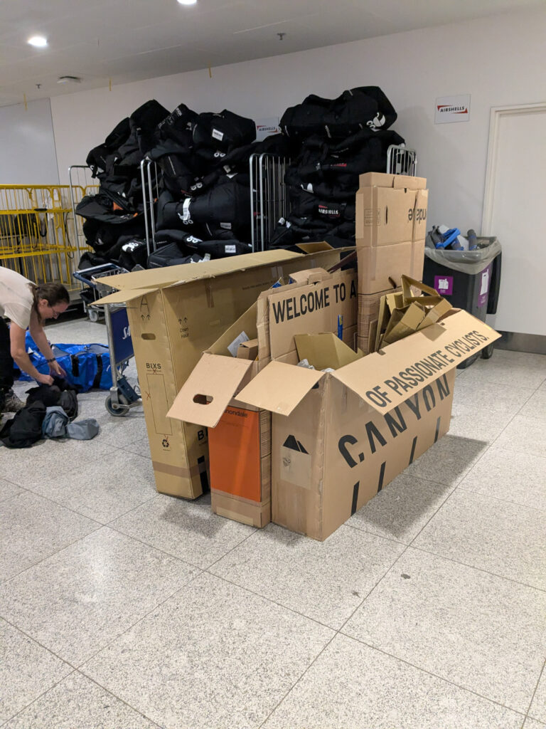 Mit etwas Verspätung gestartet und gelandet kam unser Gepäck und die Fahrradkartons aber bald danach schon übers Band gerollt und wir konnten wohl so um 22:30 Uhr damit beginnen unsere Räder direkt am Flughafen wieder zusammenzubauen und mit Gepäck zu beladen. Nach etwas mehr als einer Stunde hatten wir die vier Drahtesel fahrbereit. Die Kartons konnten wir direkt am Flughafen entsorgen. Mit der Metro fuhren wir dann noch etwa 30 Minuten in die Stadt, wo wir in einem Aussenquartier in einer Wohnung übernachtet haben. Wir kamen wohl so um halb 1 Uhr ins Bett. Den Morgen danach nahmen wir dann relativ gemütlich und haben uns erstmal was zum Frühstück besorgt und sind danach in die Ferien losgefahren.